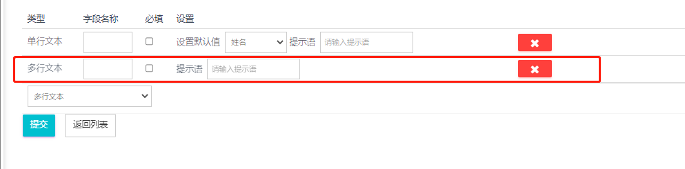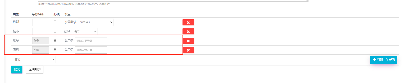 选中类型后点击添加字段,类型有:单行文本、多行文本、下拉框、多选框、单选框、图片、日期、城市、账号密码(账号密码是用于供应商申请表单使用时才会显示)。每个字段可以拖动互换位置。