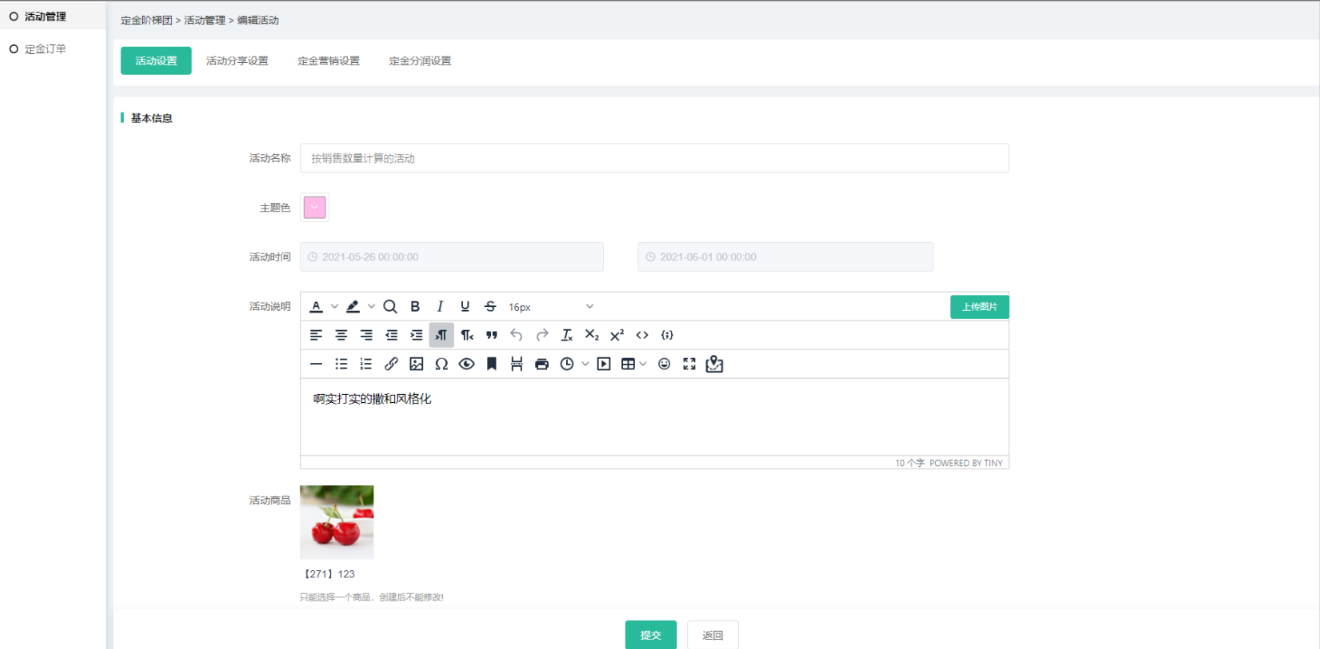 (4)营销设置和分润可设置活动定金的营销及分润信息,相应插件如未开启,则无法 设置,分润中所有插件都没开启则不会有分润设置导航;