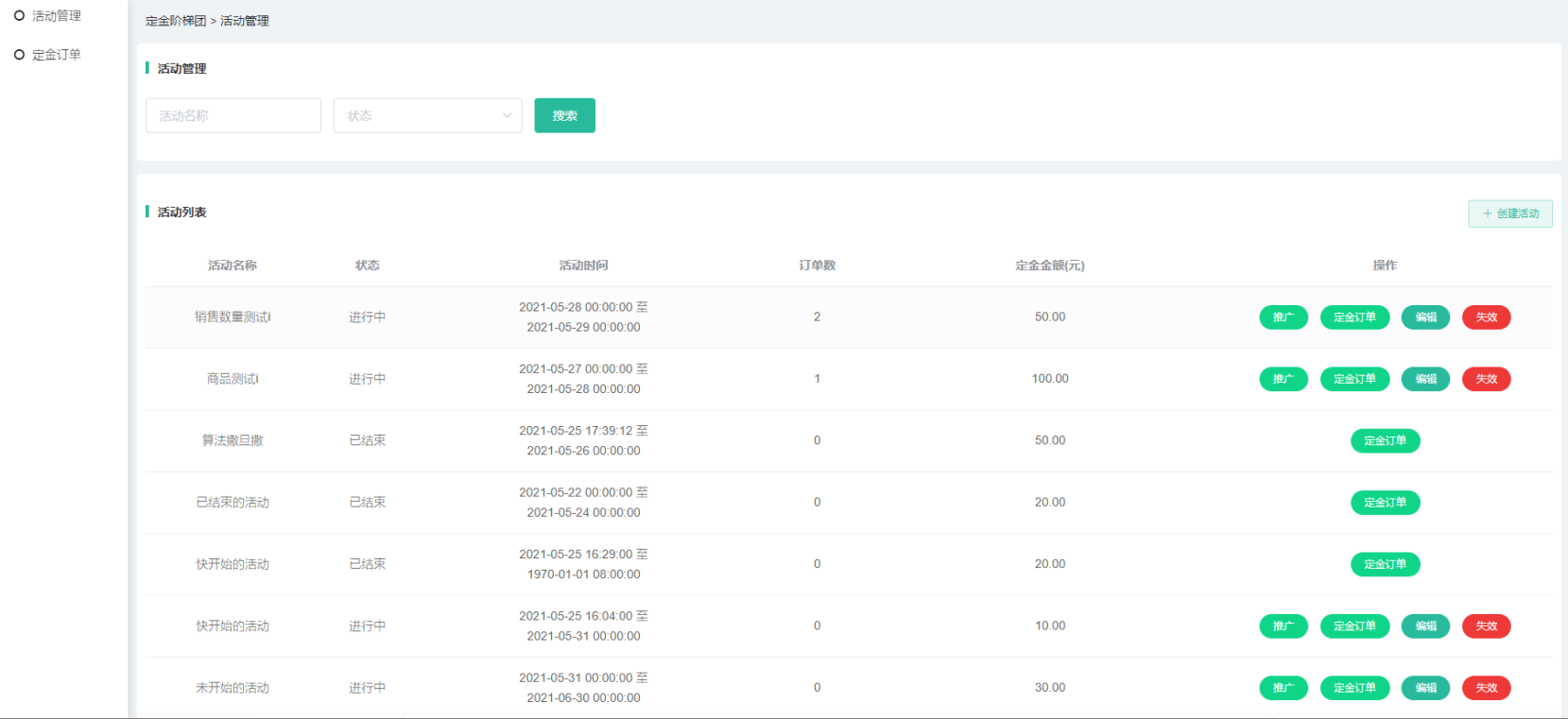 (3)进行中或者自动下单失败的活动可以点击失效,活动会失效,并把活动的定金订 单全部退款并关闭;