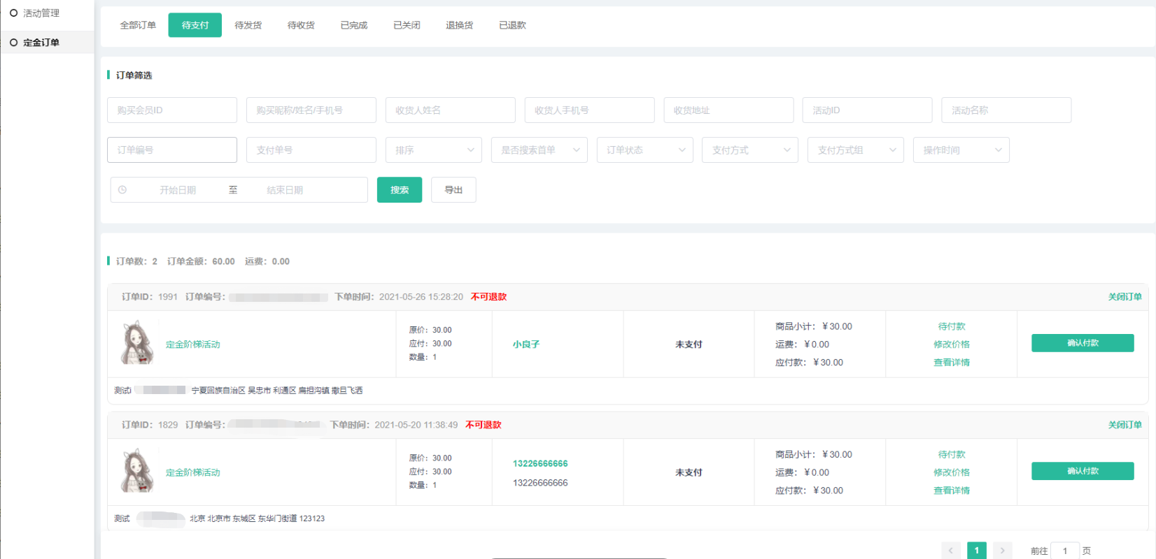 (4)点击定金订单,跳转定金订单页面,自动搜索该活动的所有定金订单;