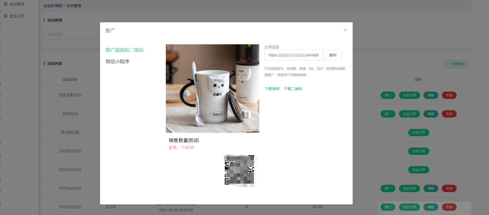 (2)点击推广,可生成活动对应海报及活动详情相应的链接;
