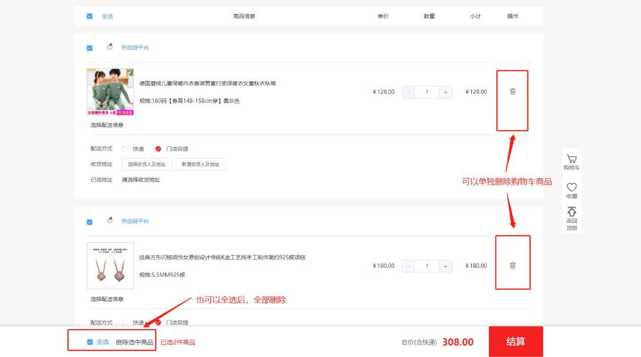 删除有两个操作,可以删除选中的商品(左下角),也可以针对每个商品进行删除(右边);