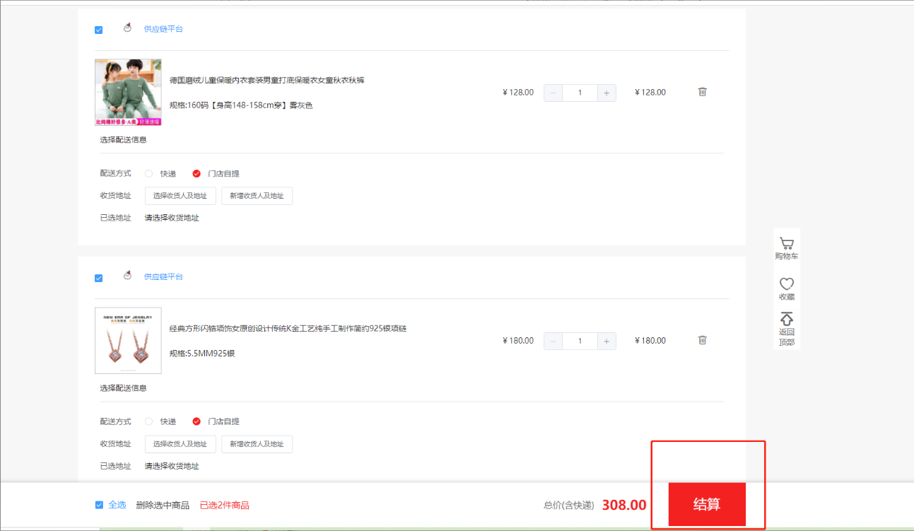 1)设置好配送方式,收货地址之后就可以点击结算(右下角红色的)