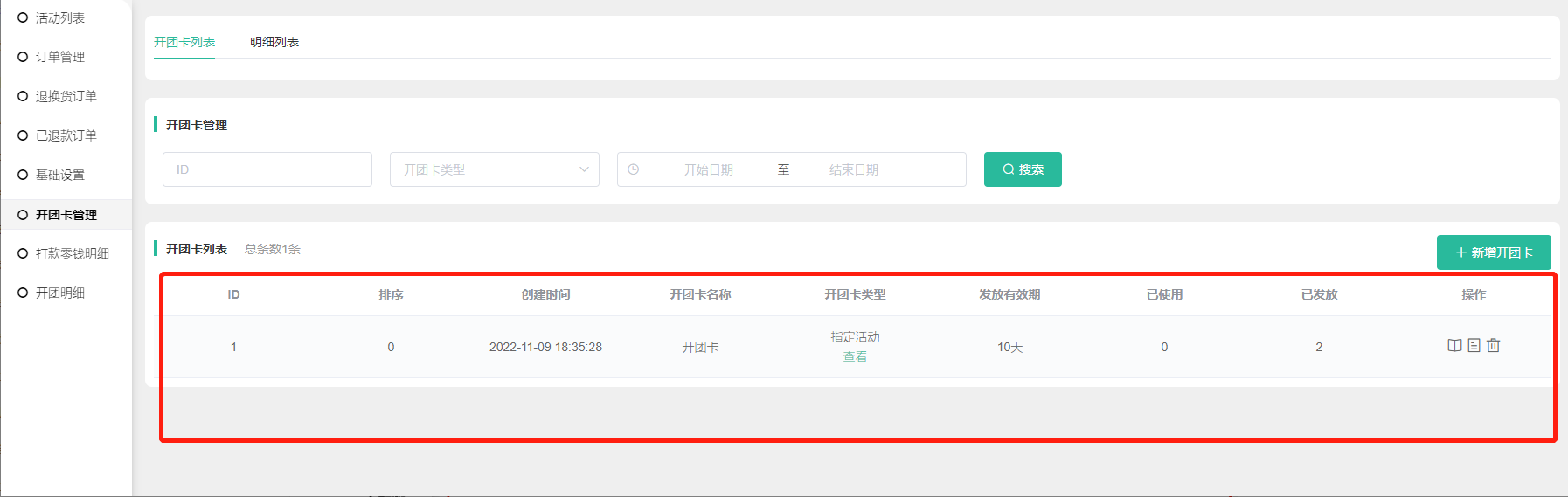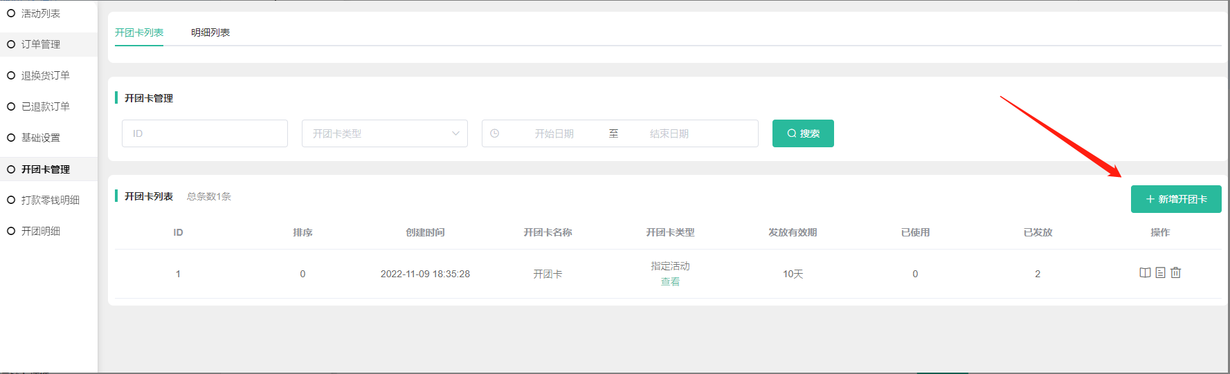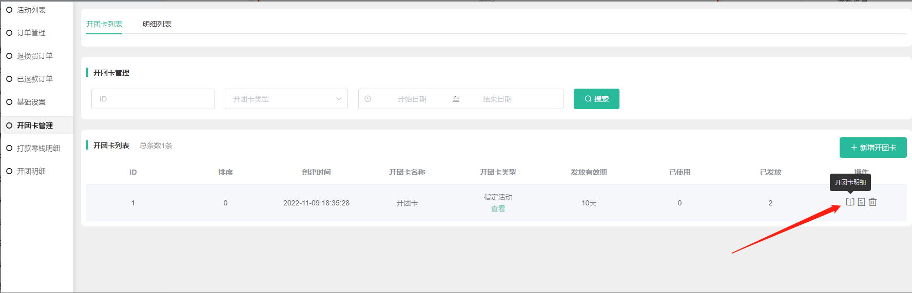 4, 在开团卡列表可查看到开团卡名称、开团卡类型,指定活动类型的可点击查看活动,发放有效天数,已使用数量、已发放数量