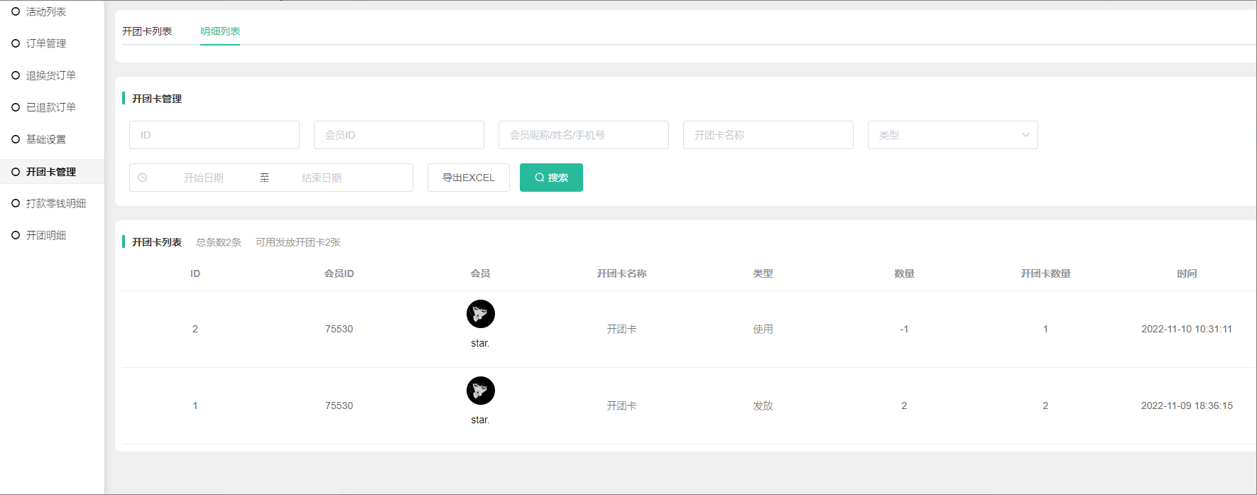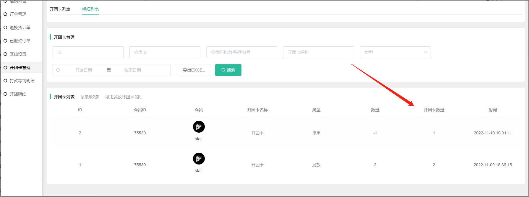 2) 开团卡数量:该开团卡该会员的可使用数量