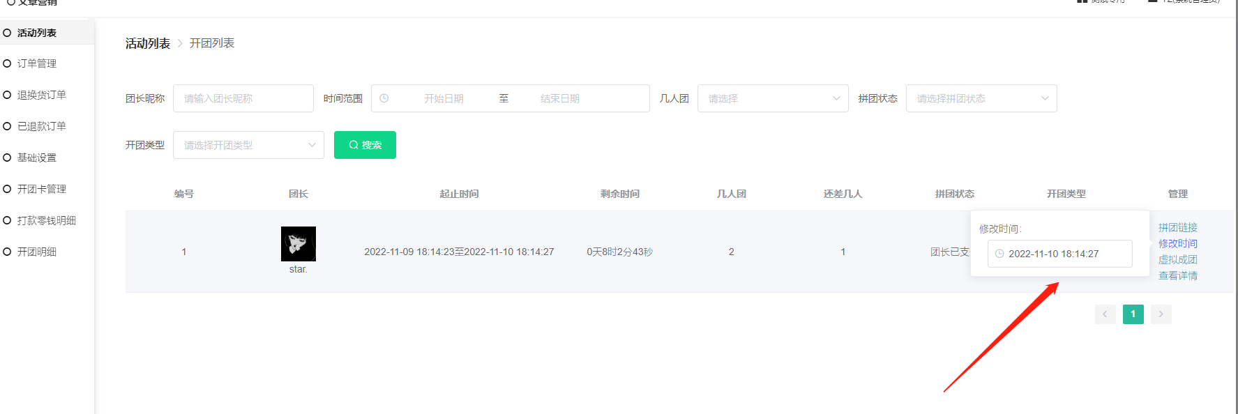 1) 此列表显示拼团团长、起止时间、剩余时间、几人团、还差几人、拼团状态、开团类型