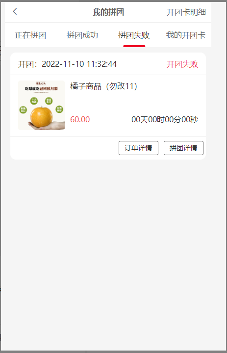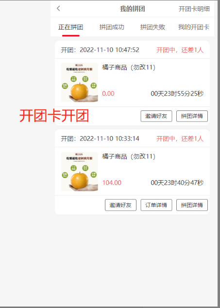 2, 正在拼团:还未拼成功的团,状态处团长显示开团中,拼团会员显示拼团中,开团卡开的团没有订单详情按钮