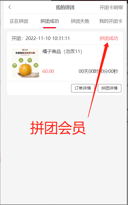 4, 拼团成功:状态处团长显示开团成功,拼团会员显示拼团成功
