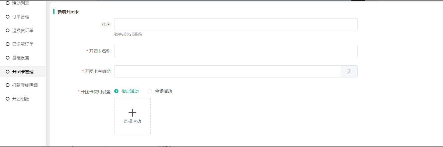 2, 新建开团卡:设置开团卡排序(数字越大排在前面,仅后端开团卡列表的显示),开团卡名称,开团卡有效期(设置为0发放后大概十分钟过期),开团卡活动,指定活动可设置多个