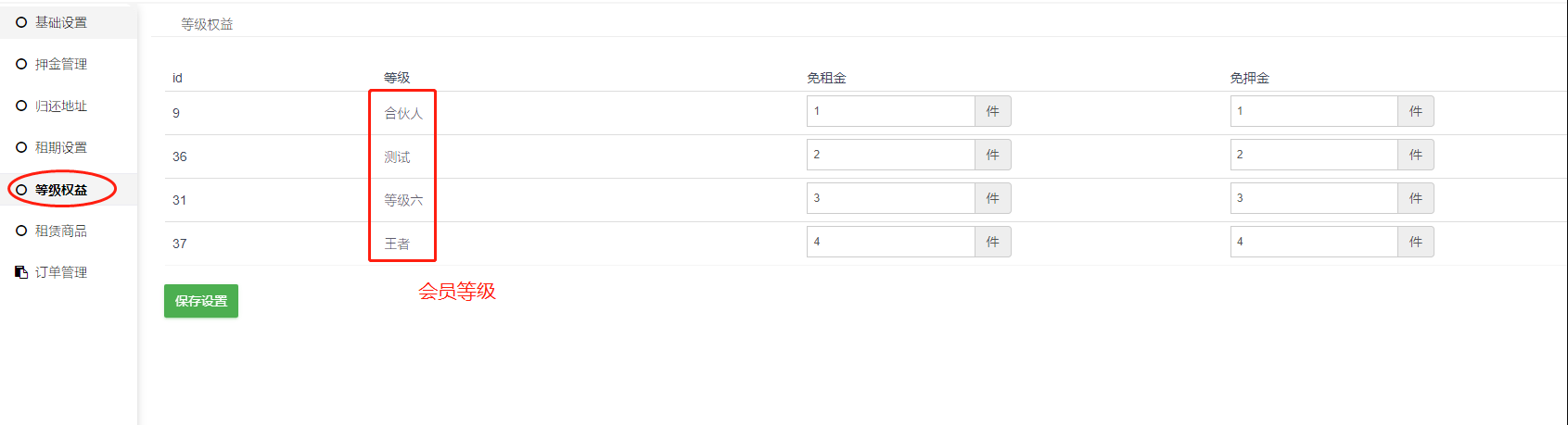 免租金:该等级享受的租赁商品免租金数量,比如设置为2,则该等级可以免租金使用2件支持该等级权益的租赁商品。