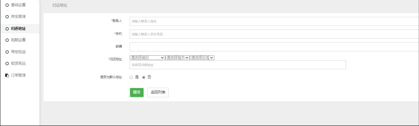 支持添加多个归还地址:联系人、手机、邮编、归还地址、是否默认地址,用户归还租赁商品时可以选择归还到添加的任意地址。