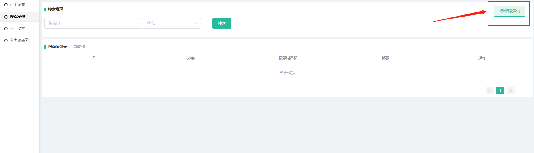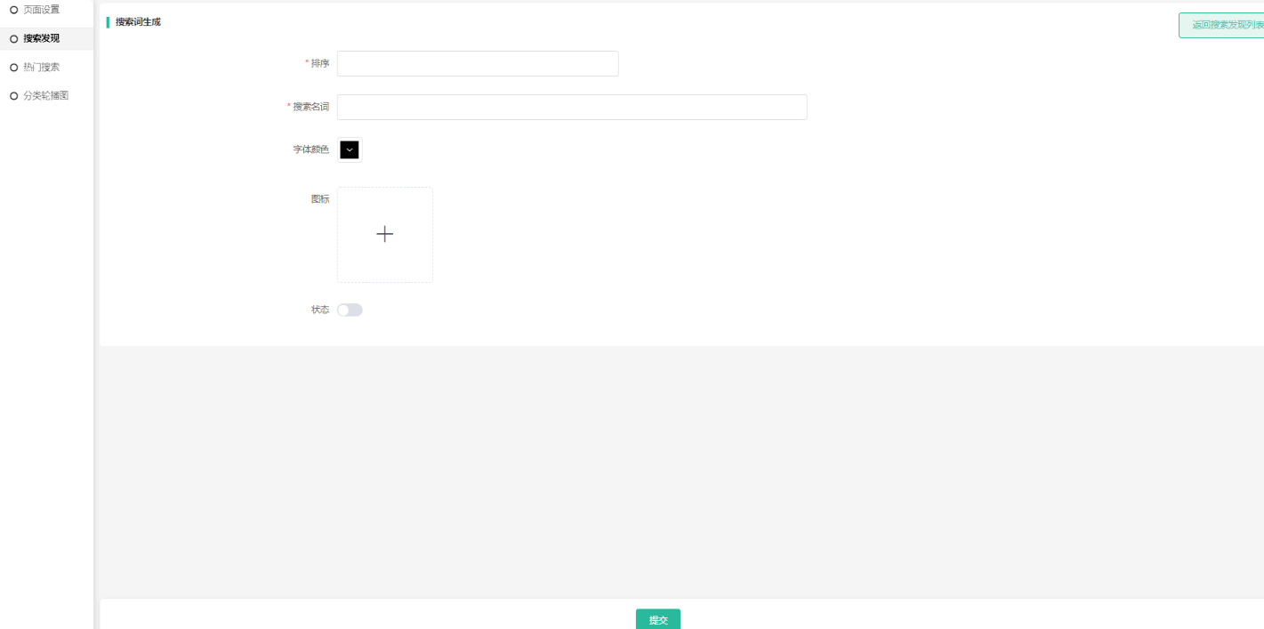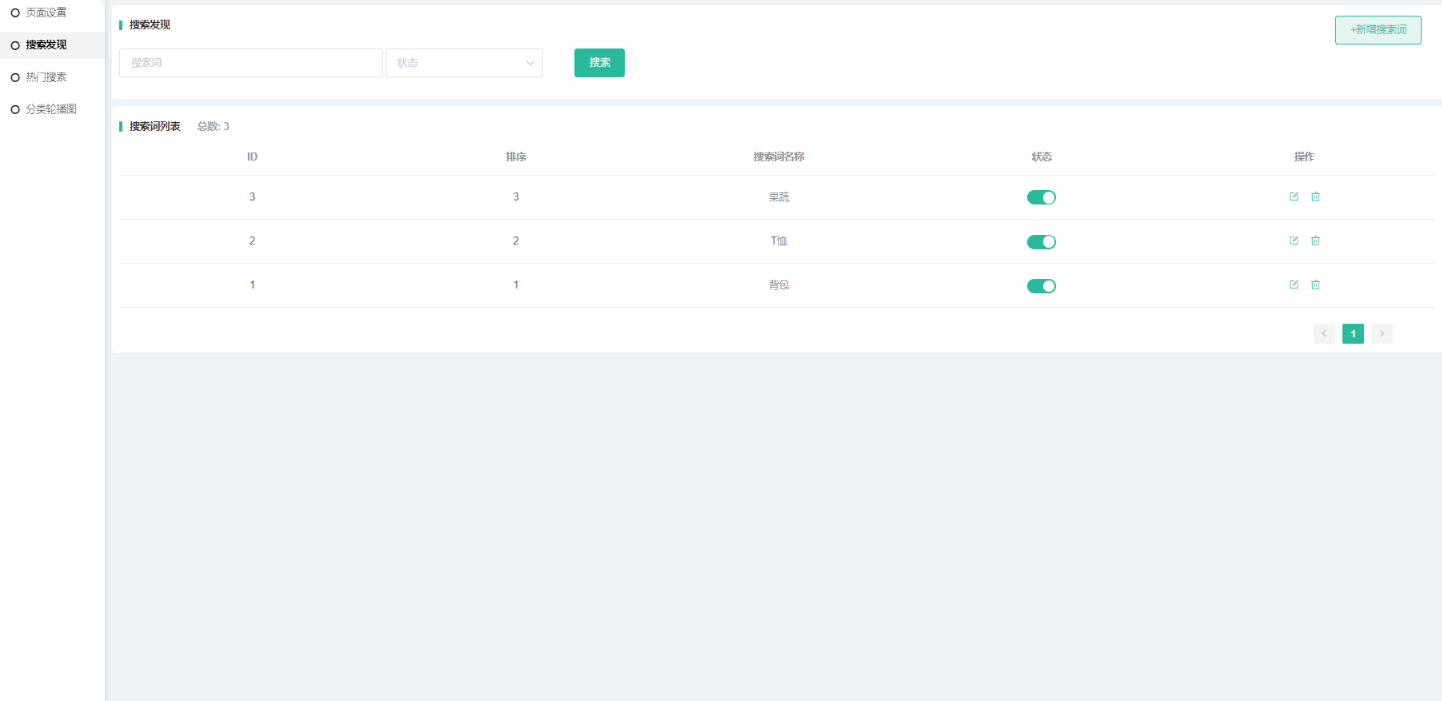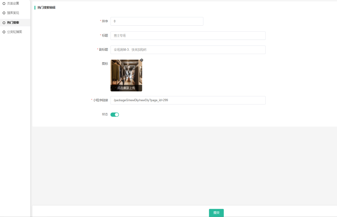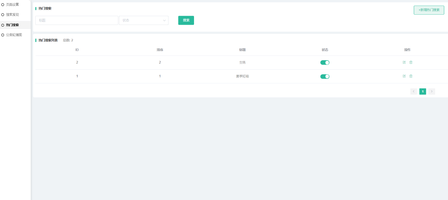 1、添加热门搜索,设置排序(数字大靠前显示;排序数字一样创建ID小靠前显示)、标题、副标题、图标、小程序链接,是否开启。