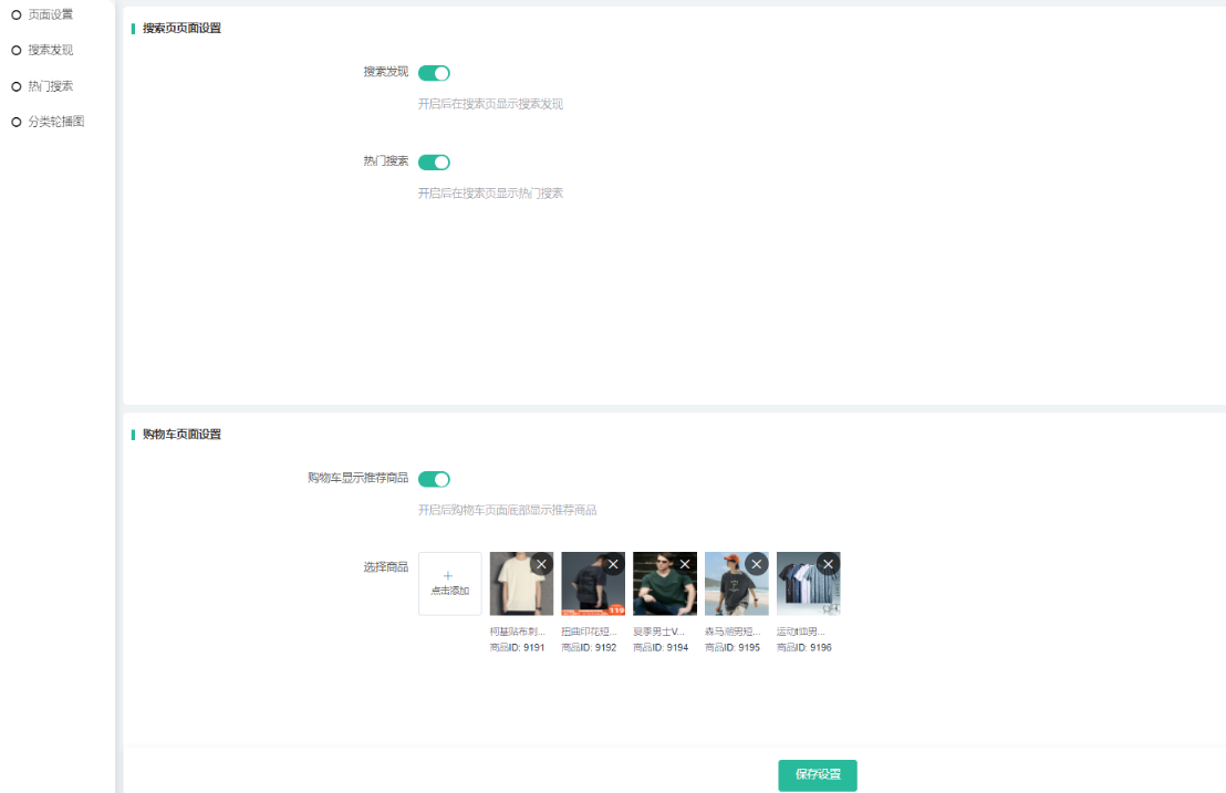 页面设计功能 帮助平台打造人货相遇新触点。搜索页显示搜索发现、热门搜索;分类页显示顶部图片;购物车显示推荐商品。仅支持小程序端。